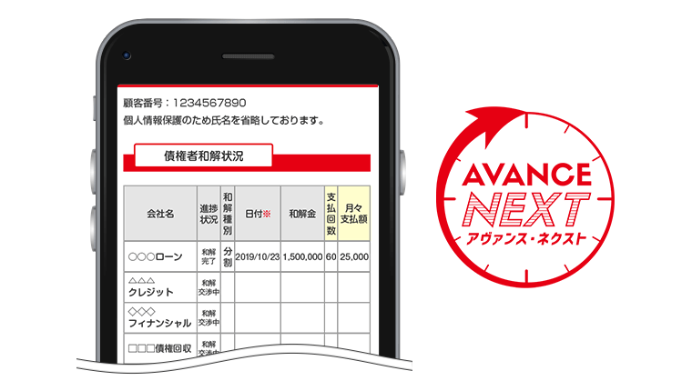 そうならないために、当事務所で返済の管理をさせていただきます。毎月、一括でアヴァンスにお振込みいただきましたら、こちらで各金融会社へ振り分けて返済を行います。万が一、延滞をしてしまっても、金融会社からの連絡はアヴァンスに入りますので、こちらで対応させていただきます。