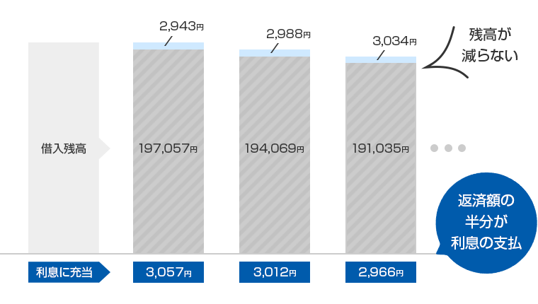上記の図のように、毎月6,000円を返済しても約半分が利息の支払いに充てられ、元金がほとんど減りません。このペースで返済した場合、完済まで約4年かかり、さらに合計で79,542円の利息を払うことになります。